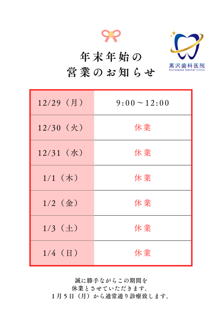 年末年始の診療時間について 投稿日 2025年12月26日 著者 黒沢歯科医院 カテゴリー お知らせ 平素より当院をご利用いただき、誠にありがとうございます。年末年始の診療時間は下記の通りとさせていただきます。 休診期間:12月30日(火)〜1月4日(日) なお、1月5日(月)より通常通り診療を行います。休診期間中はご不便をおかけいたしますが、何卒ご理解のほどよろしくお願いいたします。